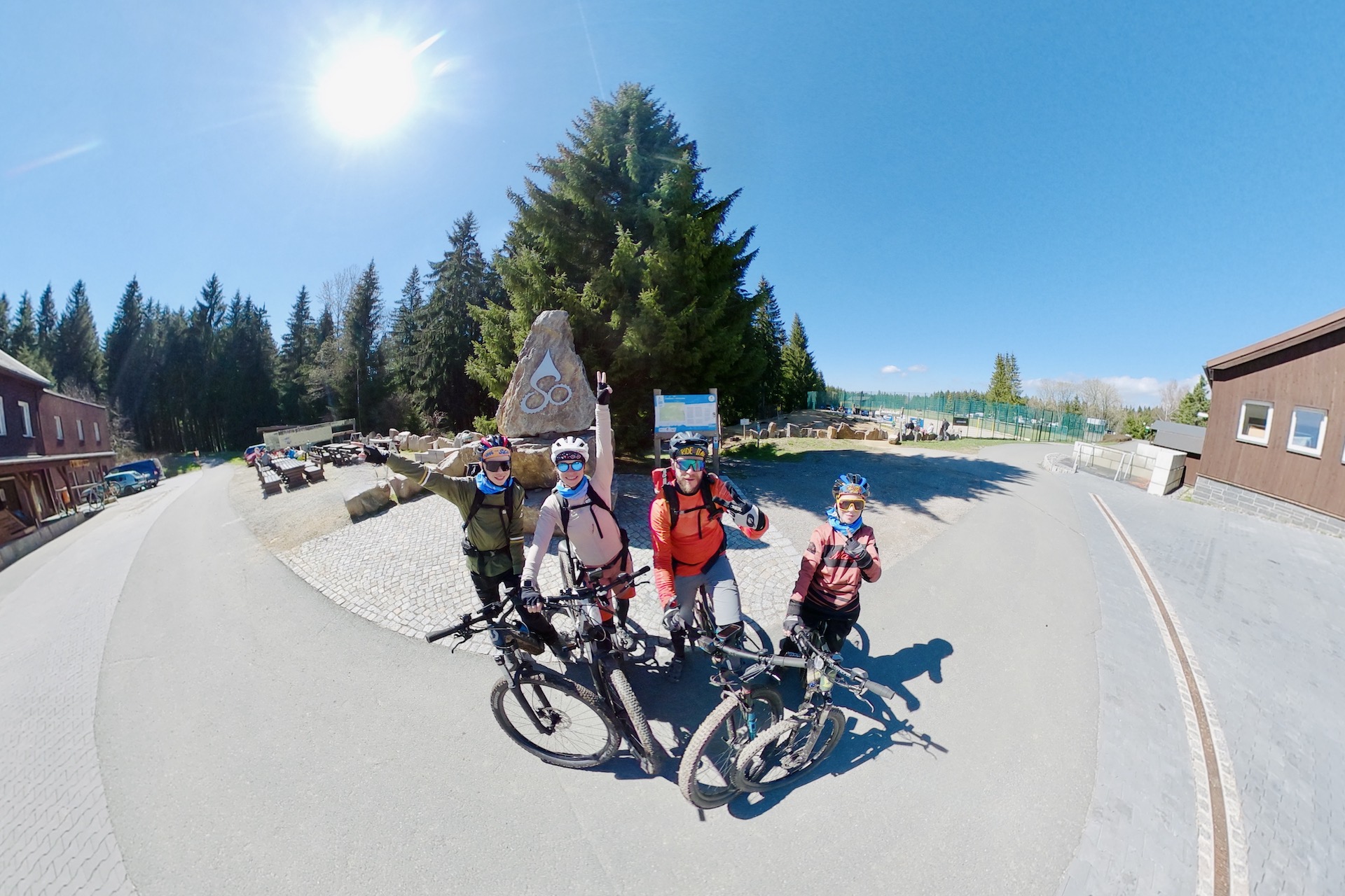 Wir hatten ein Fully-Mountainbike für Thomas am Start und 3 weitere Bikes haben wir bei Sport-Gahler in Oberwiesenthal ausgeliehen. Es waren neue E-Mountainbikes für Melanie, Flo und Ben. Das Wetter war immer noch nicht besser, aber das war uns egal, wir wollten los. So starteten wir bei regnerischem Wetter auf unsere erste Stoneman Miriquidi Etappe.
