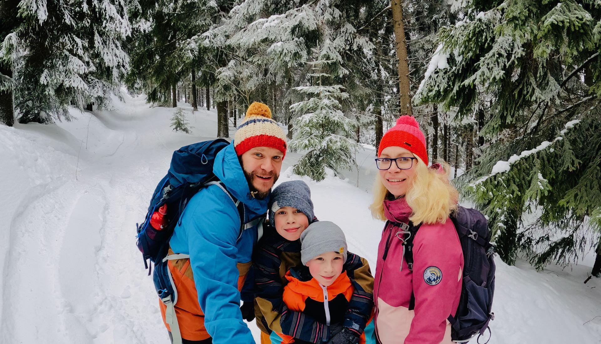 Der Weg führte richtig in den Winterwald. Dick mit Schnee bedeckte Bäume waren rings um uns herum. Wir waren fasziniert, wie schön das alles aussah. Nach einigen hundert Metern kreuzten wir eine Skipiste. Hier war wirklich niemand auf Skiern unterwegs. Nur eine Mama rodelte mit ihrem Kind auf dem Schlitten an uns vorbei. Wir überquerten die Piste und stapften weiter in den Wald.