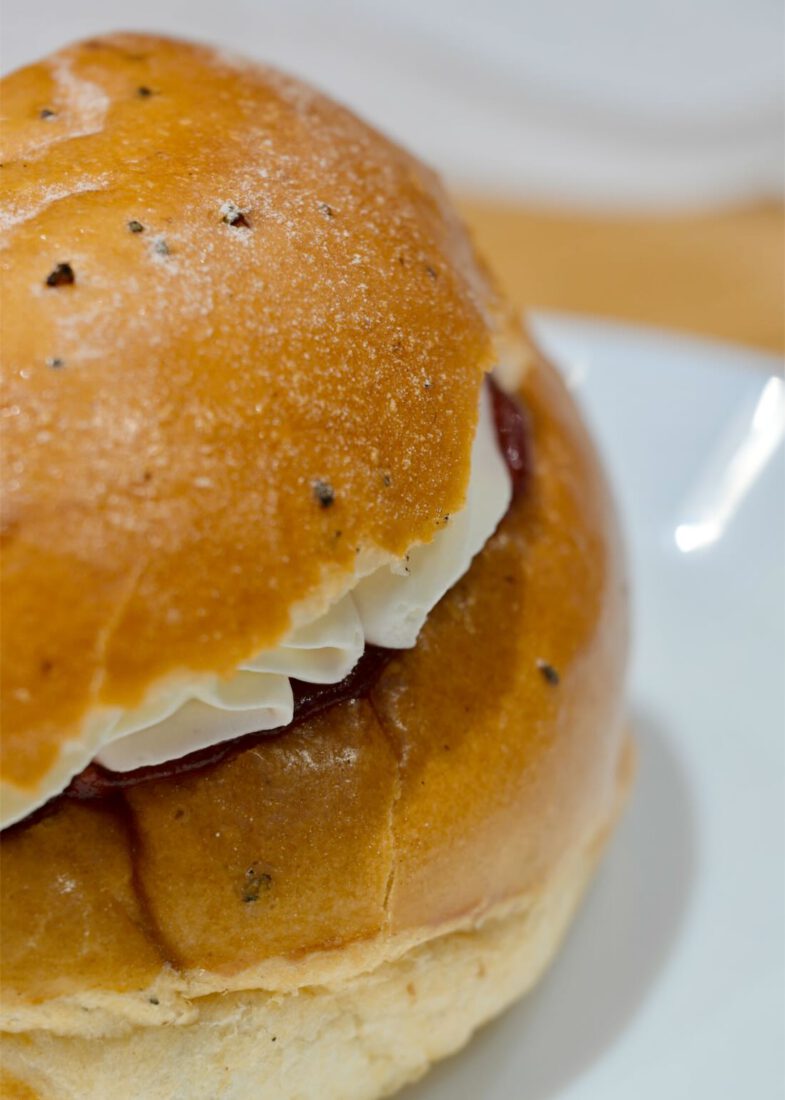 Nach dem Fisch blieben wir direkt an diesem Stand. Und zwar für den süßen Abschluss. Denn jede gute Foodtour endet mit etwas süßem. Zum Nachtisch wurde uns Laskiaispulla serviert, was im Prinzip wie eine Art Berliner Pfannkuchen ist, nur dass die Kugel aufgeschnitten wurde und mit Marmelade und Schlagsahne gefüllt ist. Zu den finnischen Pfannkuchen kam Filterkaffee, welcher in Finnland sehr beliebt ist. Tatsächlich haben die Finnen mit vier Tassen am Tag den höchsten Kaffee-Konsum auf der ganzen Welt.
