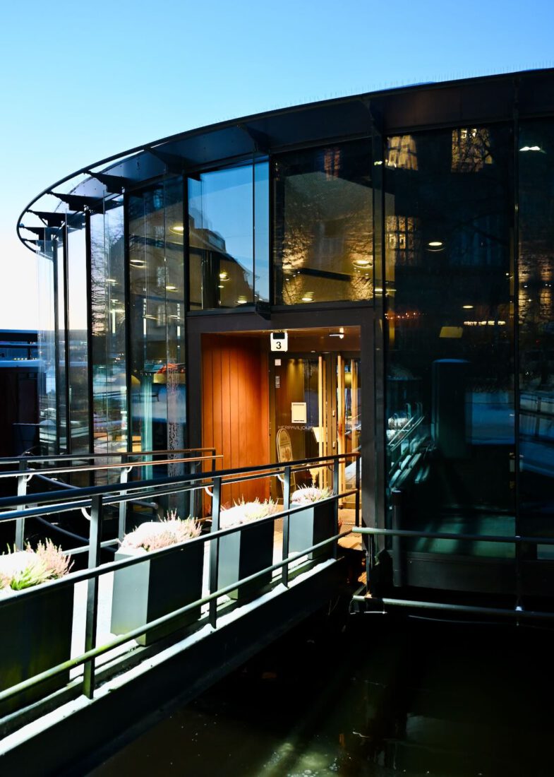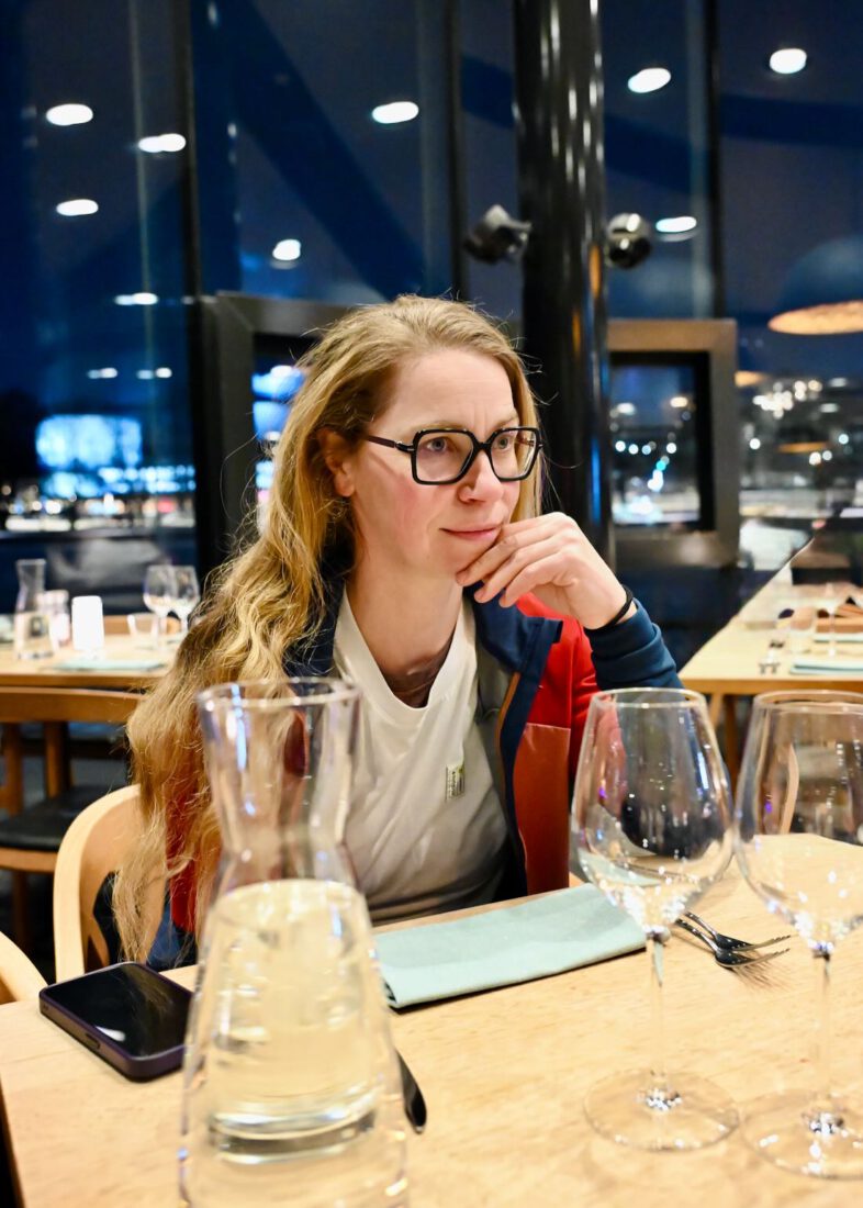 Die Foodtour endete Nachmittag. Wir spazierten noch etwa eine Stunde weiter durch die Stadt. Die Zeit verging sehr schnellend als die Sonne unter ging, wurde es dann auch ziemlich schnell sehr kalt. So war wenig später für uns schon Zeit fürs Abendessen. Zum Glück waren wir von der Foodtour nicht zu vollgefuttert und wir hatten noch Platz im Bauch. Da Maddalena sich in Helsinki am besten auskennt und dementsprechend auch die besten Restaurants kennt, fragte wir einfach sie. Wir hatten Lust auf Fisch und dafür ist das Restaurant Meripaviljonki perfekt. Das Restaurant schwimmt auf dem Wasser in einer kleinen Bucht. Im Sommer hat man hier einen phänomenalen Blick auf den Sonnenuntergang. Der Winter dagegen zeigt sich abends natürlich dunkel, aber nicht weniger schön.