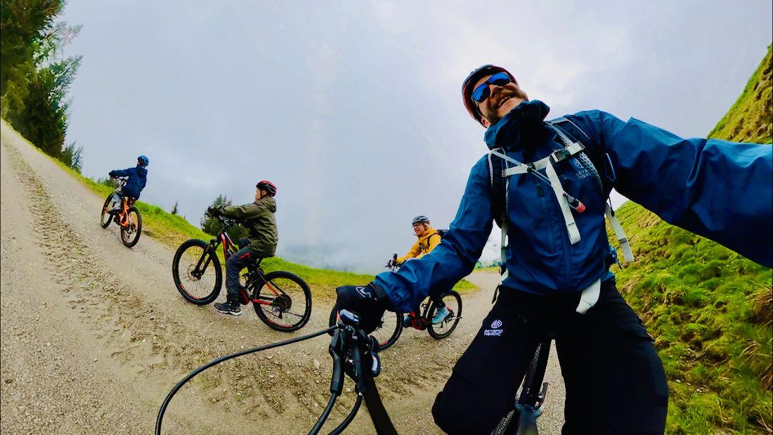 Für die Tour hatten wir einen Guide. Er hieß Dennis und er sollte uns für den Tag begleiten. Dennis führte uns bergauf über Strassen und Wege bis zur Haagalm auf über 1300 Metern Höhe. Die Berge der Kitzbüheler Alpen steckten in den Wolken fest und so hatten wir leider nicht die ganz weite Aussicht. Das war uns egal, denn wir hatten eine Menge Spaß auf den Rädern.