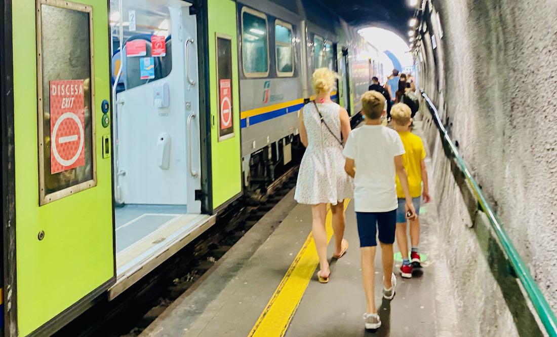 Wir starteten noch vor dem Frühstück mit dem Auto Richtung Cinque Terre. Dort war Levento, ein kleiner Ort vor den Cinque Terre unser erster Ziel. Denn von hier fährt ein Zug zwischen Levento und La Spezia durch alle fünf Dörfer der Cinque Terre. Das Familien-Ticket kostet 48 Euro für den ganzen Tag und man kann in jedem Dorf aussteigen. Der Zug fährt ca. alle 20 Minuten. Also genügend Zeit um alle fünf Dörfer an einem Tag zu besichtigen. Der erste Zug war übrigens relativ entspannt gefüllt und so sollte es auch den ganzen Tag bleiben.